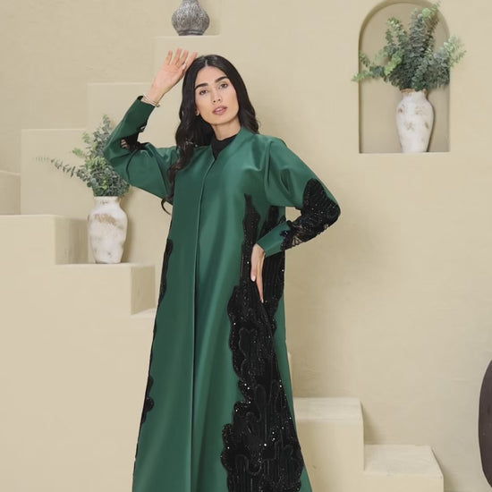 A luxurious satin abaya elevated with perforated, embellished velvet accents along the sides and sleeves. The contrast between luminous satin and detailed velvet creates a bold, refined statement. Perfect for celebrations, festive gatherings, and elegant occasions.