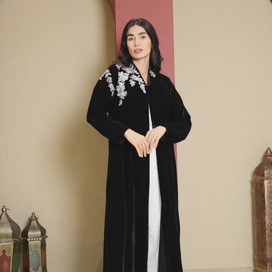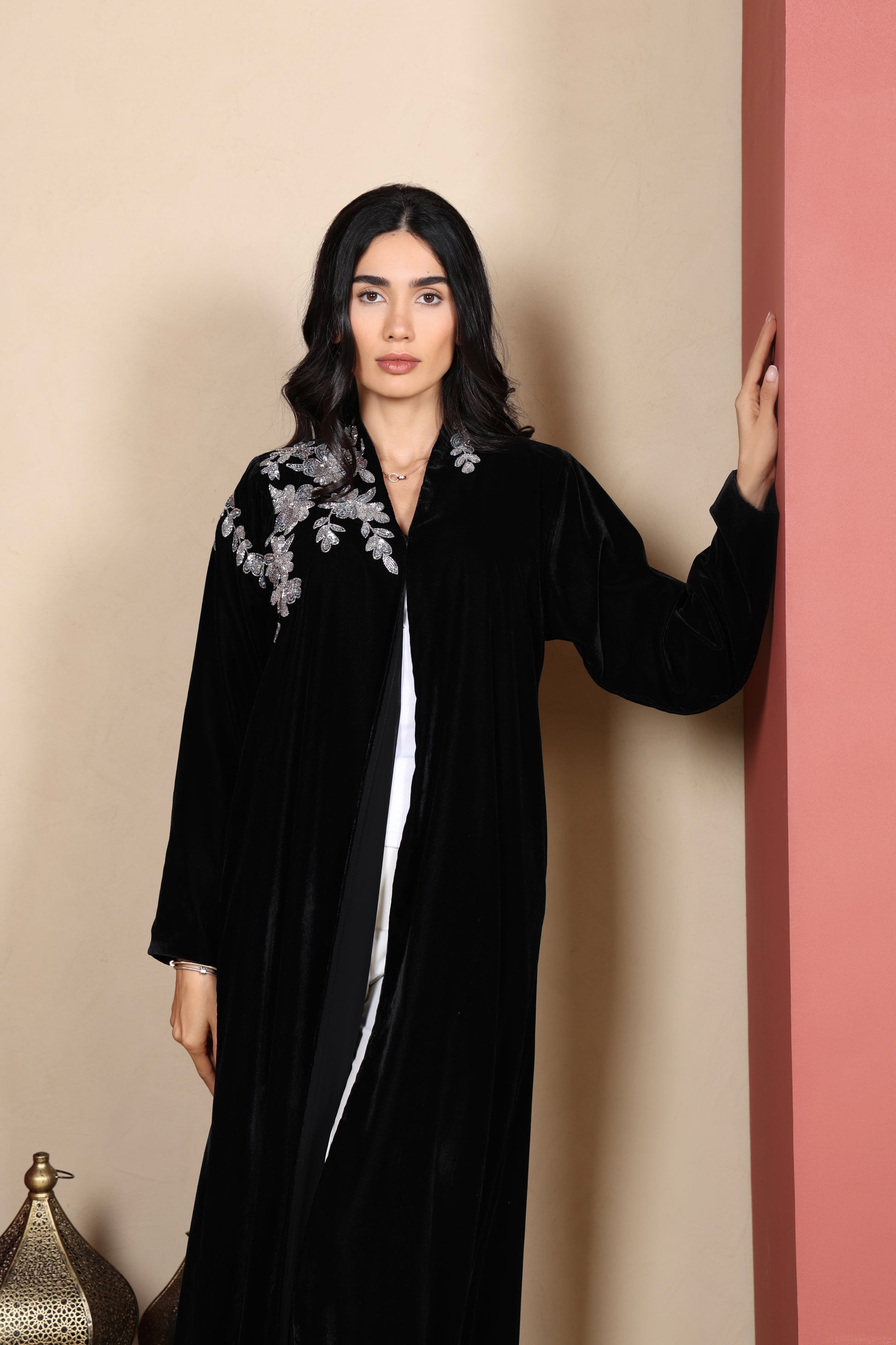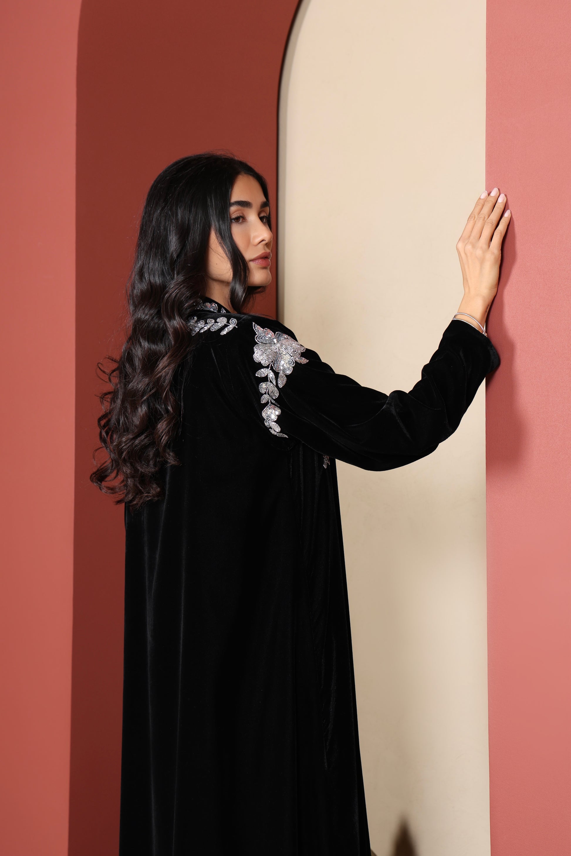 A luxurious formal abaya with a structured silhouette and regal collar. Beadwork rose branches flow gracefully along the neckline, adding subtle velvet elegance. A striking, refined piece perfect for formal events and high-end gatherings.