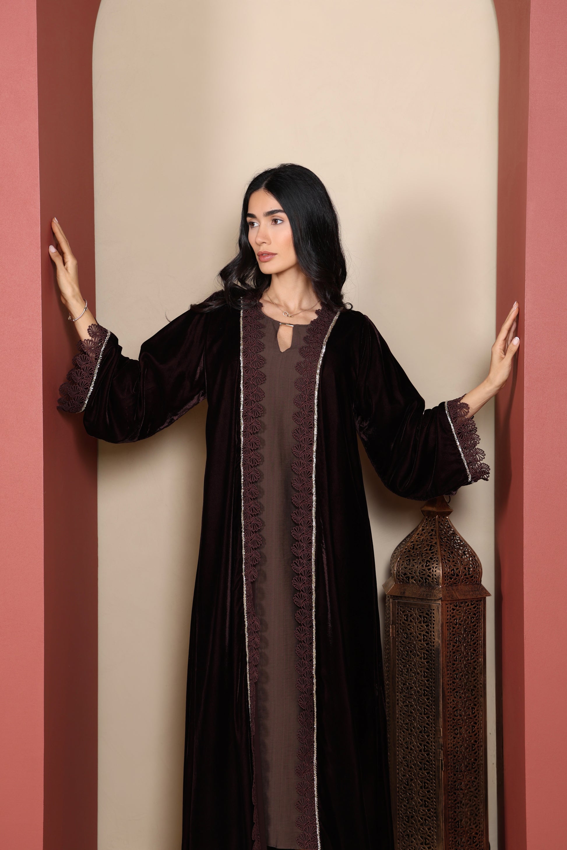 Brown Velvet Abaya with Golden Beadwork and Lace